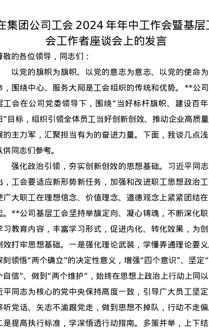 在集团公司工会2024年年中工作会暨基层工会工作者座谈会上的发言