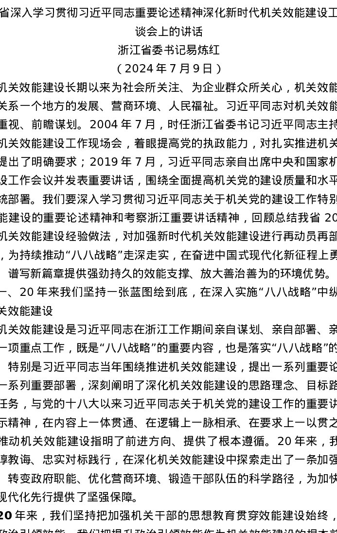 最新讲话系列11205浙江省委书记易炼红:在全省深入学习贯彻习近平总书记重要论述精神深化新时代机关效能建设工作座谈会上的讲话