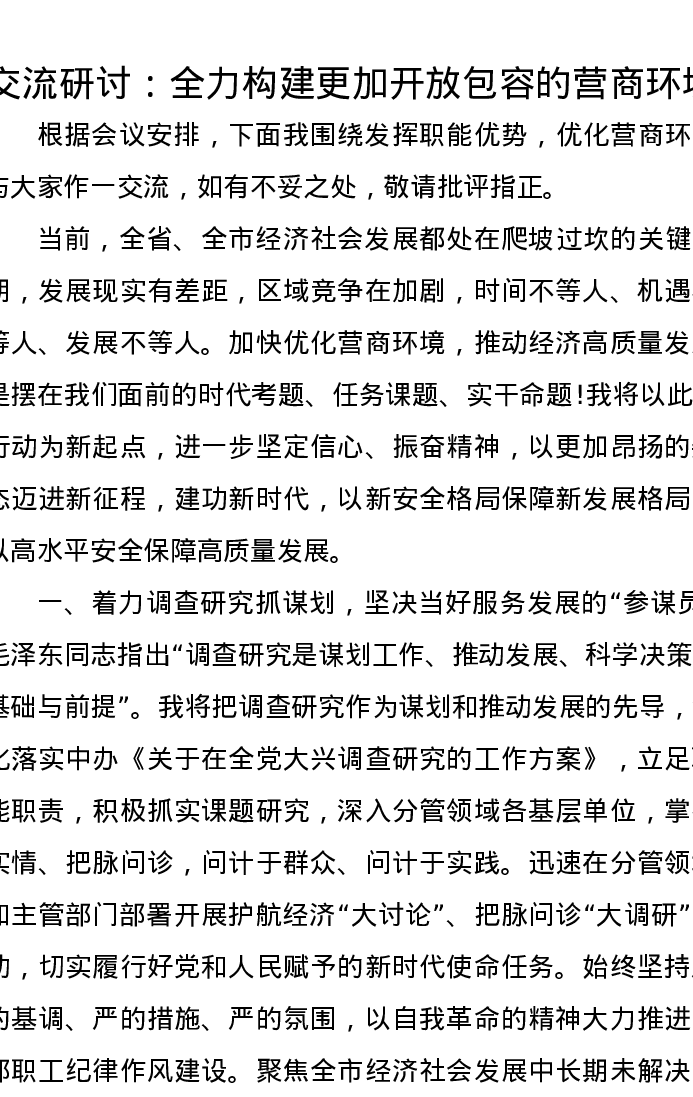 交流研讨发言:全力构建更加开放包容的营商环境