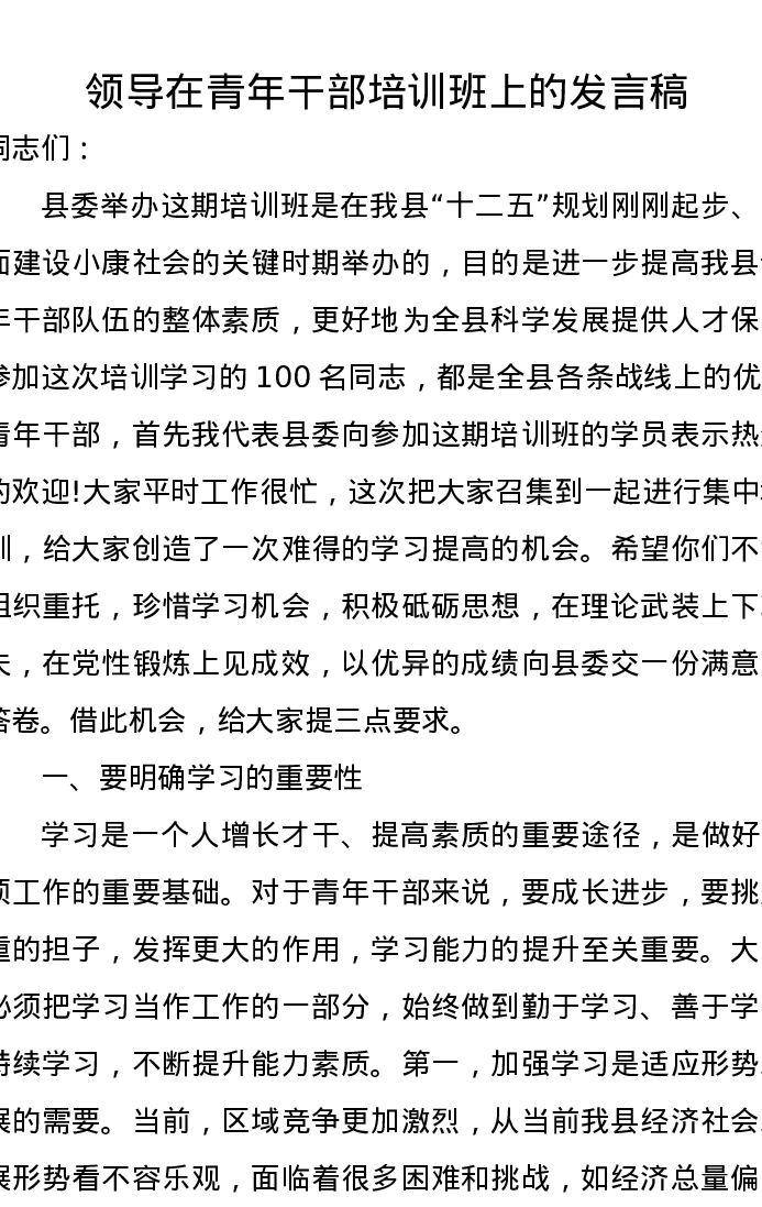 领导在青年干部培训班上的发言稿