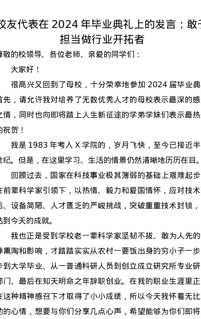 校友代表在2024年毕业典礼上的发言:敢于担当做行业开拓者