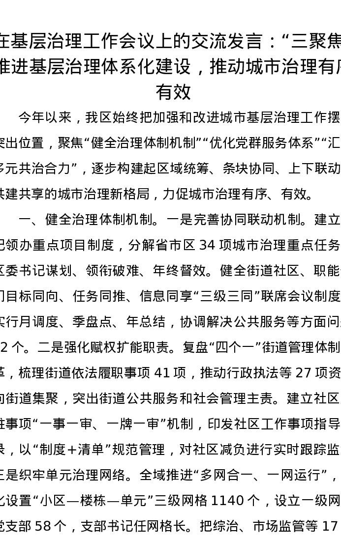 在基层治理工作会议上的交流发言:“三聚焦”推进基层治理体系化建设,推动城市治理有序、有效