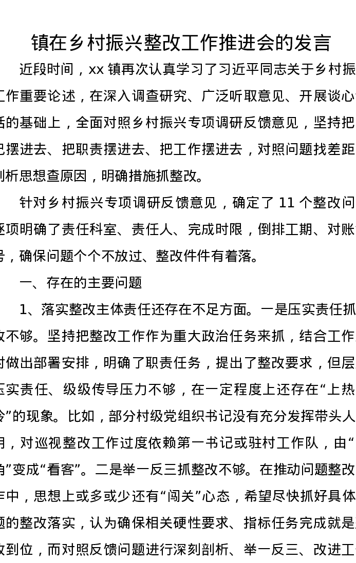 镇在乡村振兴整改工作推进会的发言