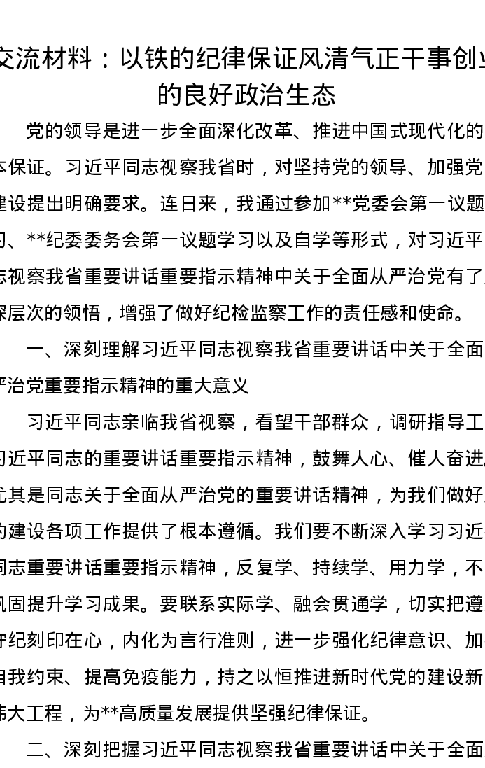 交流发言材料:以铁的纪律保证风清气正干事创业的良好政治生态