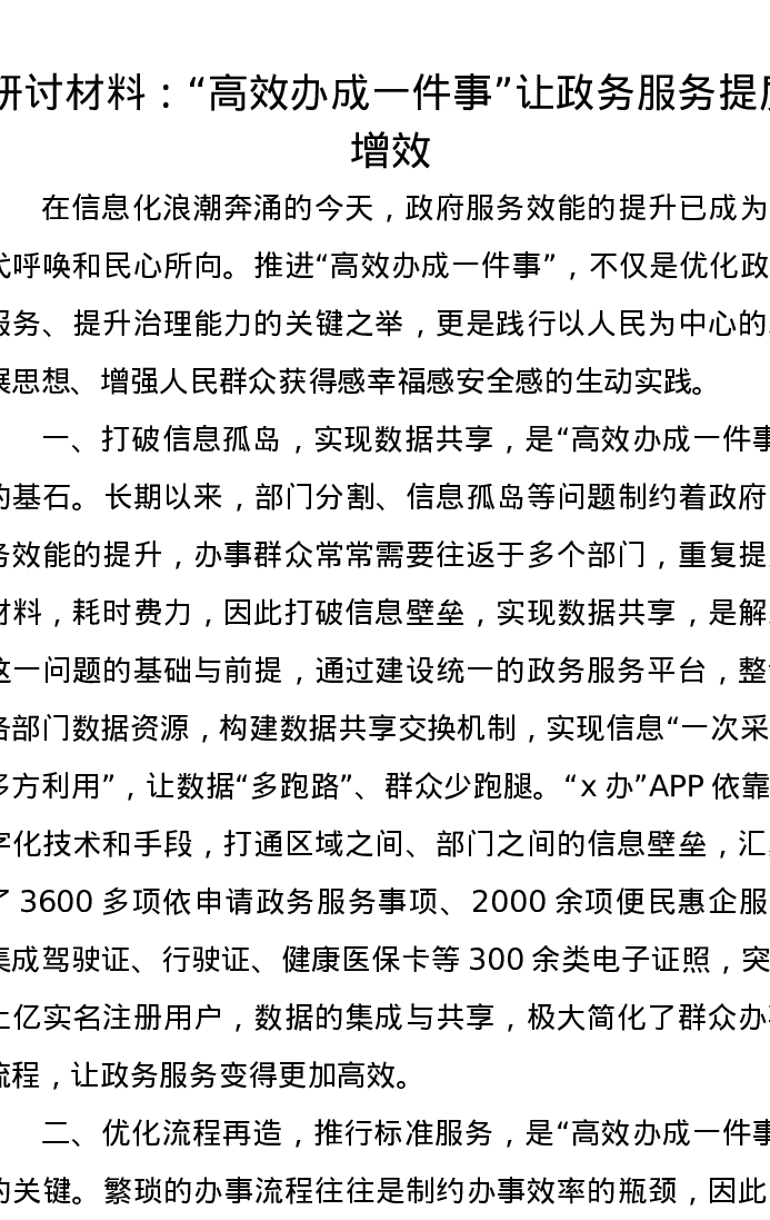 研讨发言材料:“高效办成一件事”让政务服务提质增效