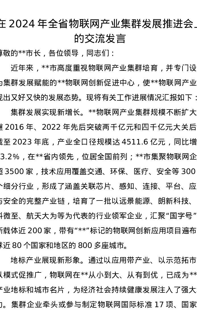 在2024年全省物联网产业集群发展推进会上的交流发言