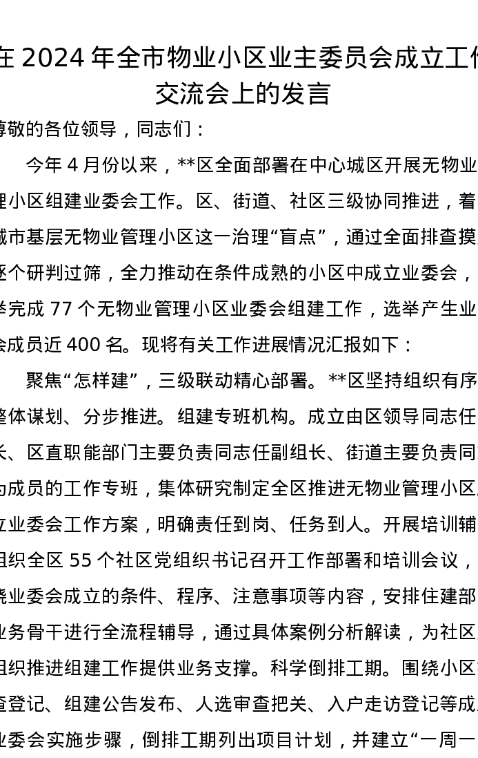 在2024年全市物业小区业主委员会成立工作交流会上的发言