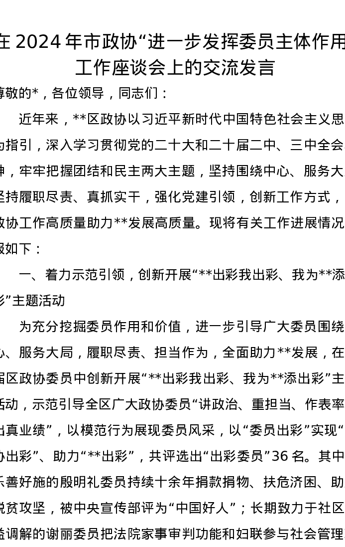 在2024年市政协“进一步发挥委员主体作用”工作座谈会上的交流发言
