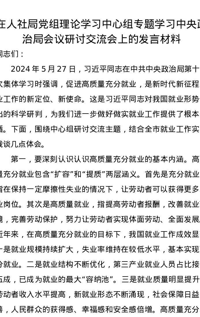 在人社局党组理论学习中心组专题学习中央政治局会议研讨交流会上的发言材料