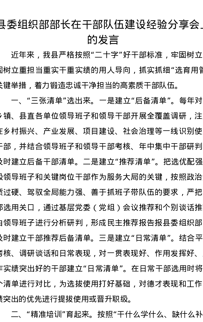 县委组织部部长在干部队伍建设经验分享会上的发言
