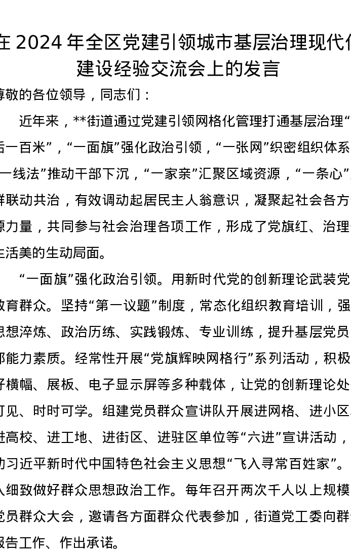 在2024年全区党建引领城市基层治理现代化建设经验交流会上的发言