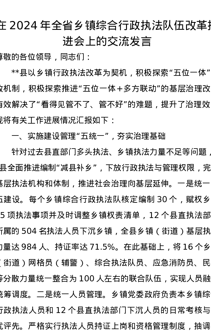 在2024年全省乡镇综合行政执法队伍改革推进会上的交流发言