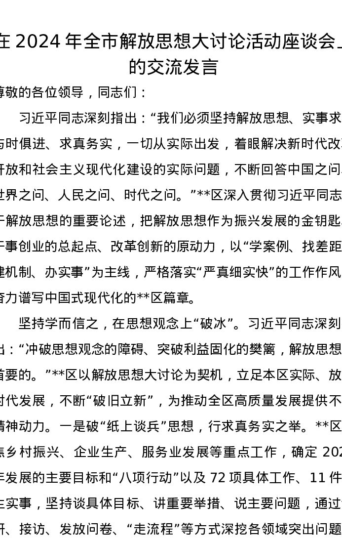 在2024年全市解放思想大讨论活动座谈会上的交流发言