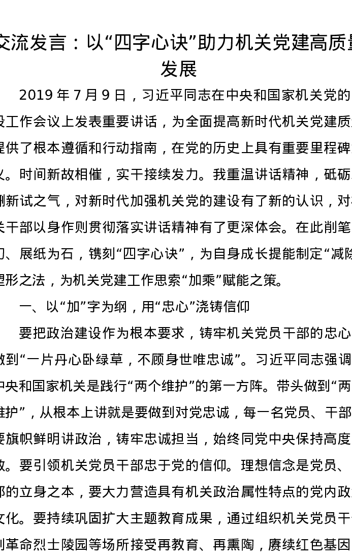 交流发言:以“四字心诀”助力机关党建高质量发展