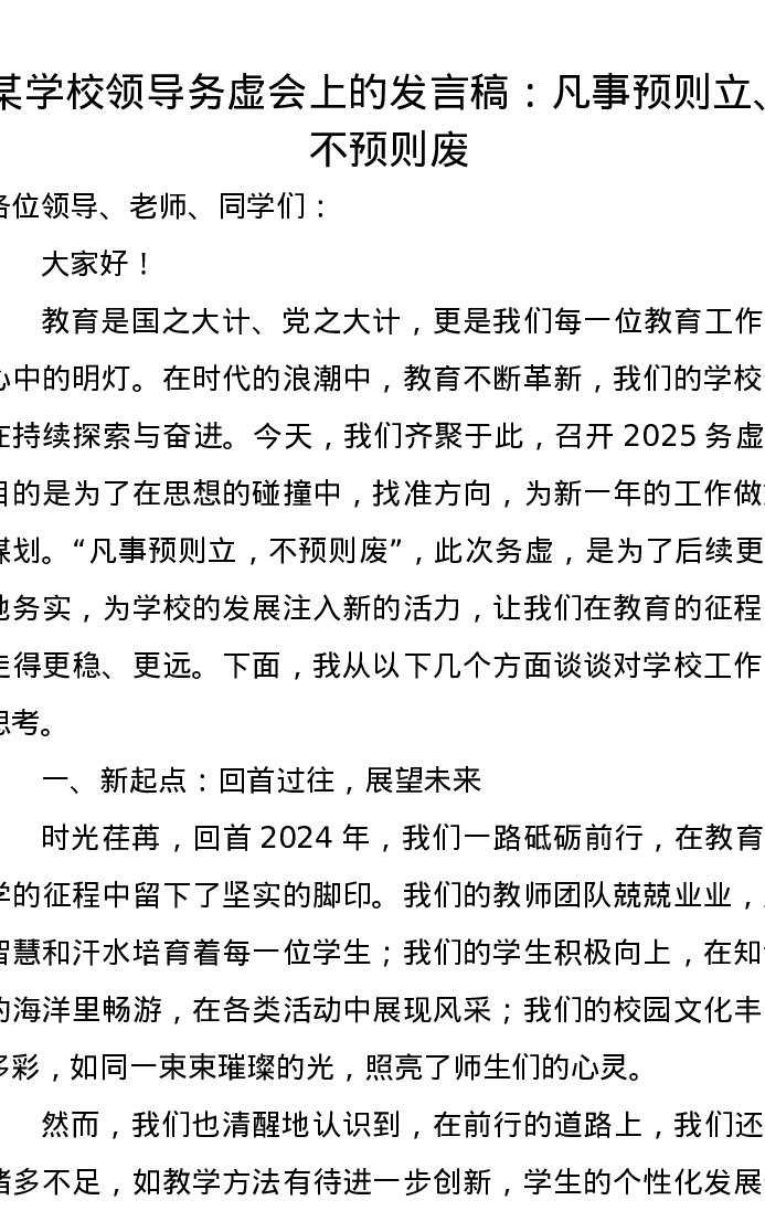 某学校领导务虚会上的发言稿:凡事预则立、不预则废
