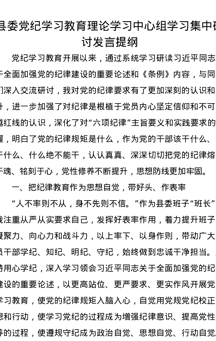 县委党纪学习教育理论学习中心组学习集中研讨发言提纲