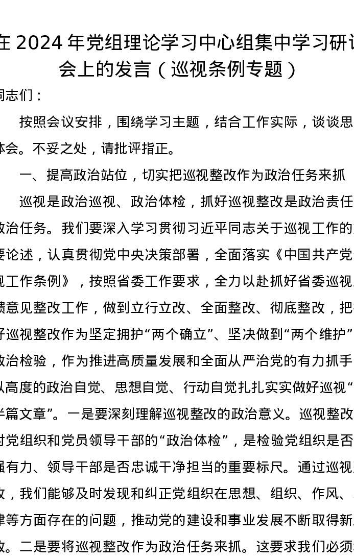 在2024年党组理论学习中心组集中学习研讨会上的发言(巡视条例专题)