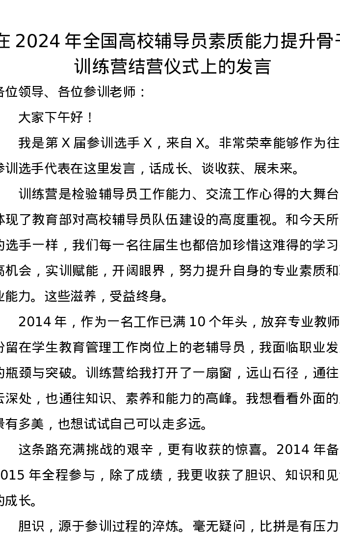 在2024年全国高校辅导员素质能力提升骨干训练营结营仪式上的发言