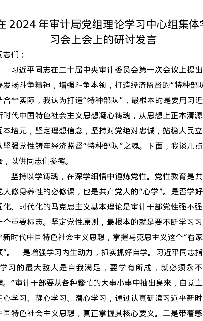 在2024年审计局党组理论学习中心组集体学习会上会上的研讨发言