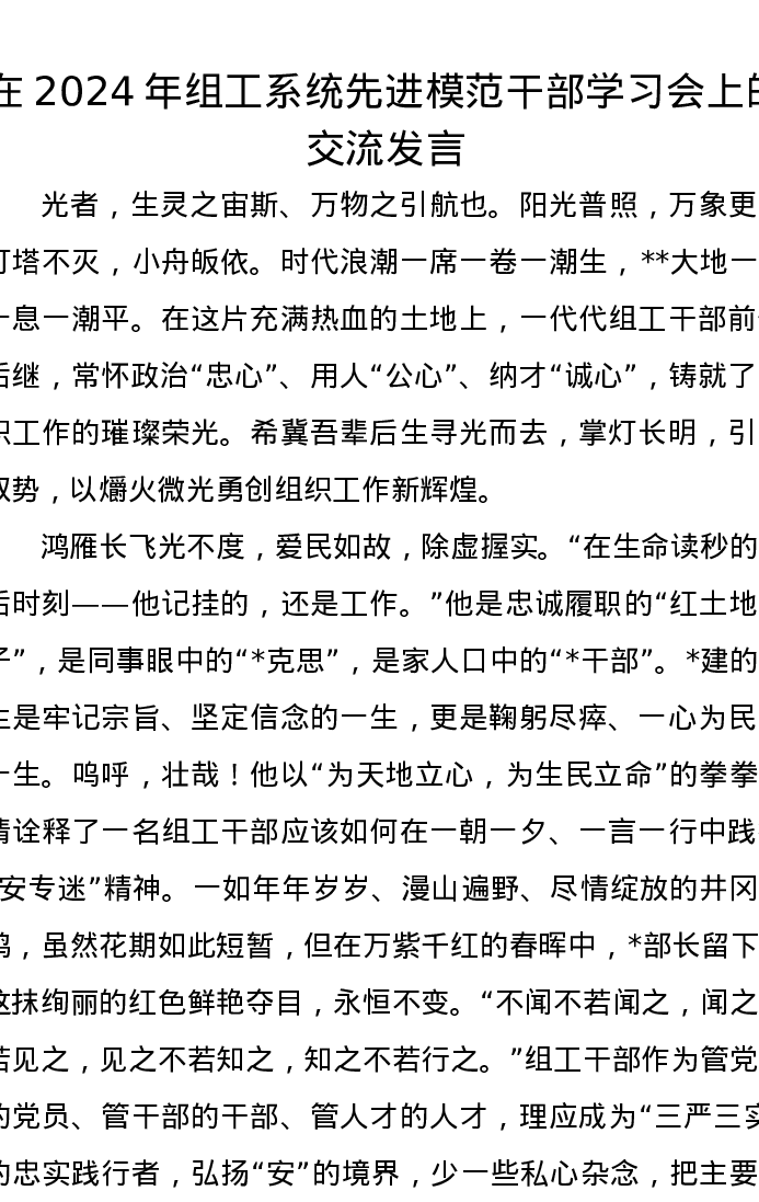 在2024年组工系统先进模范干部学习会上的交流发言