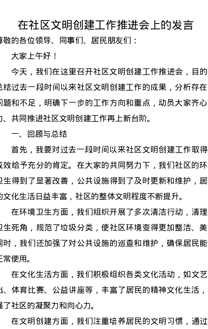 在社区文明创建工作推进会上的发言