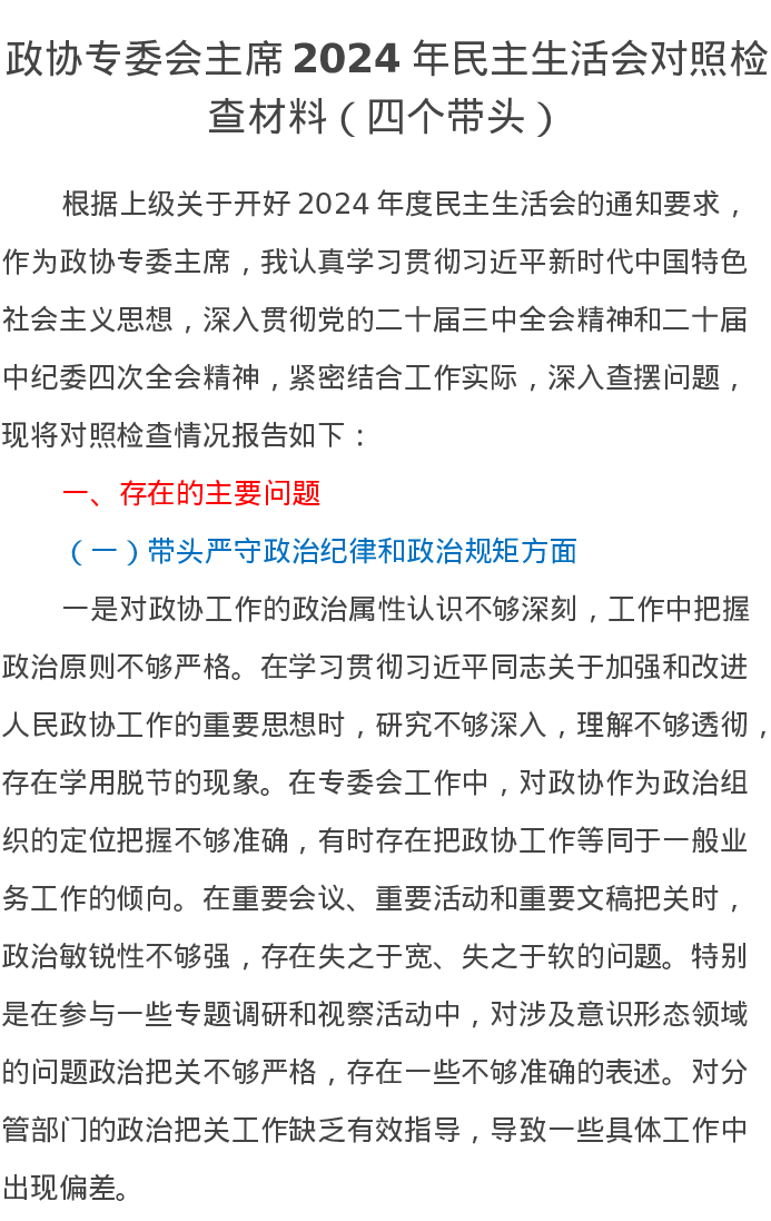 政协专委会主席2024年民主生活会对照检查材料(四个带头)