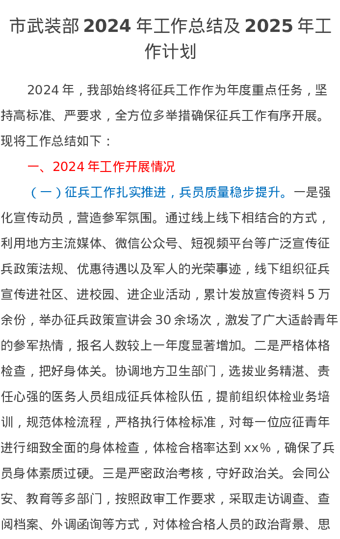 市武装部2024年工作总结及2025年工作计划