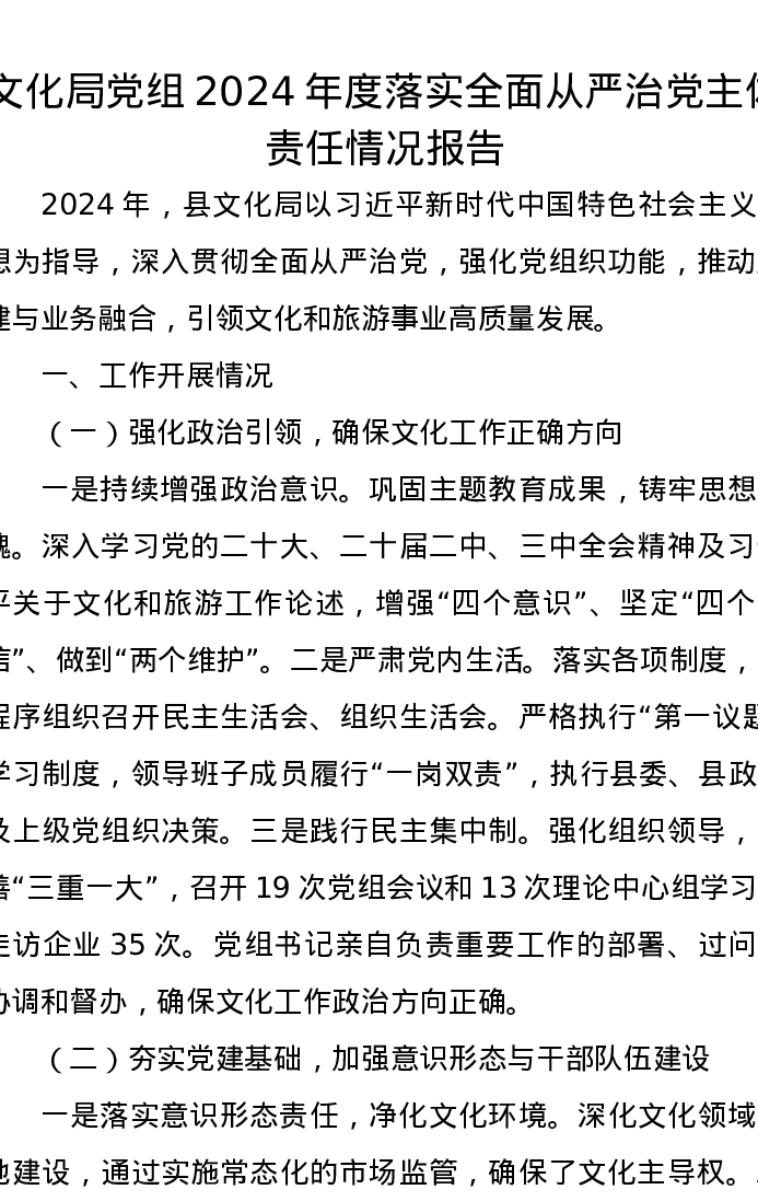 文化局党组2024年度落实全面从严治党主体责任情况报告
