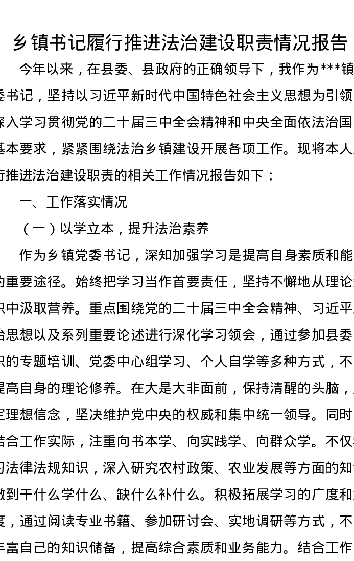 乡镇书记履行推进法治建设职责情况报告