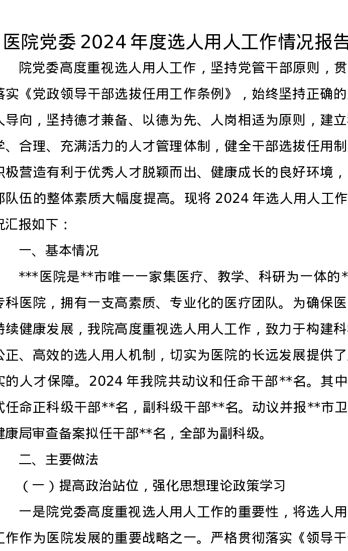 医院党委2024年度选人用人工作情况报告