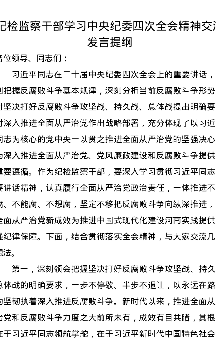 纪检监察干部学习中央纪委四次全会精神交流发言提纲