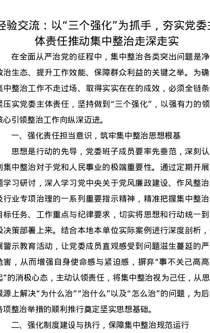经验交流:以“三个强化”为抓手,夯实党委主体责任推动集中整治走深走实