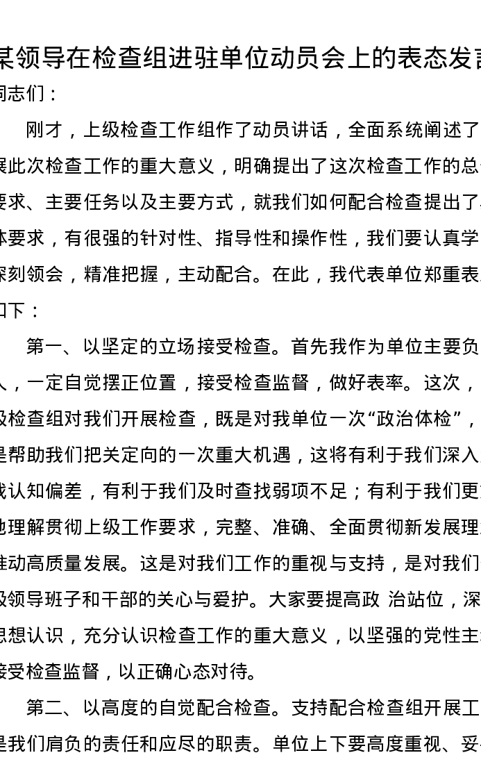 某领导在检查组进驻单位动员会上的表态发言