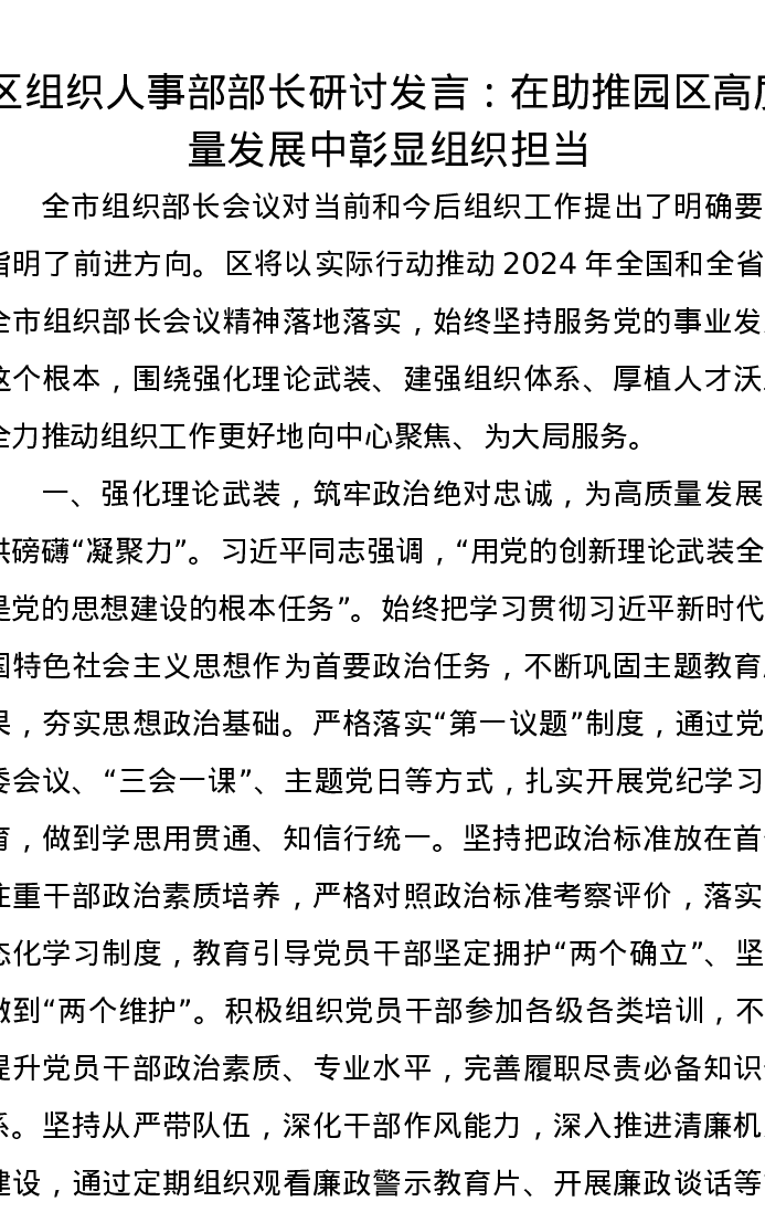 区组织人事部部长研讨发言:在助推园区高质量发展中彰显组织担当