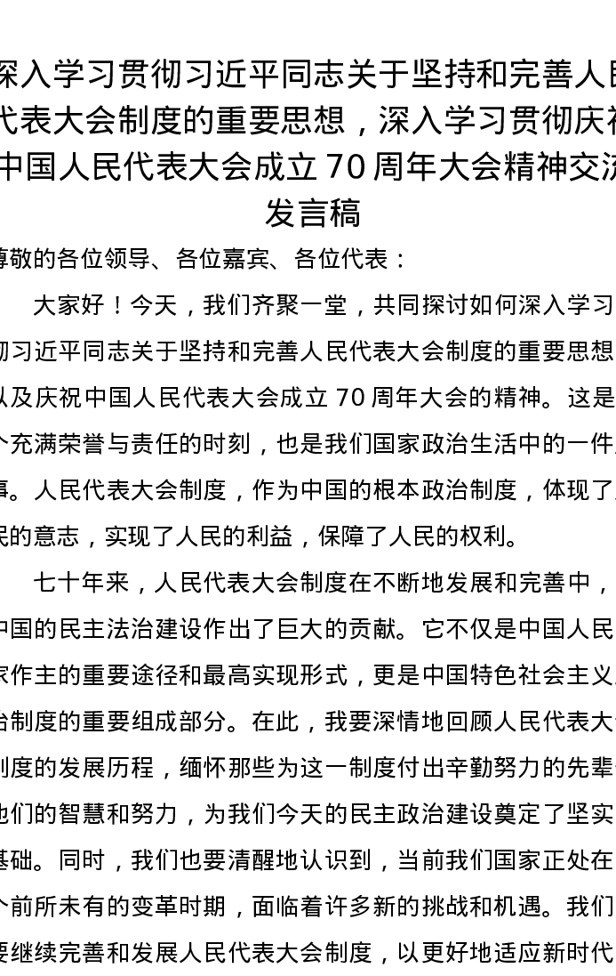 深入学习贯彻习近平总书记关于坚持和完善人民代表大会制度的重要思想,深入学习贯彻庆祝中国人民代表大会成立70周年大会精神交流发言稿