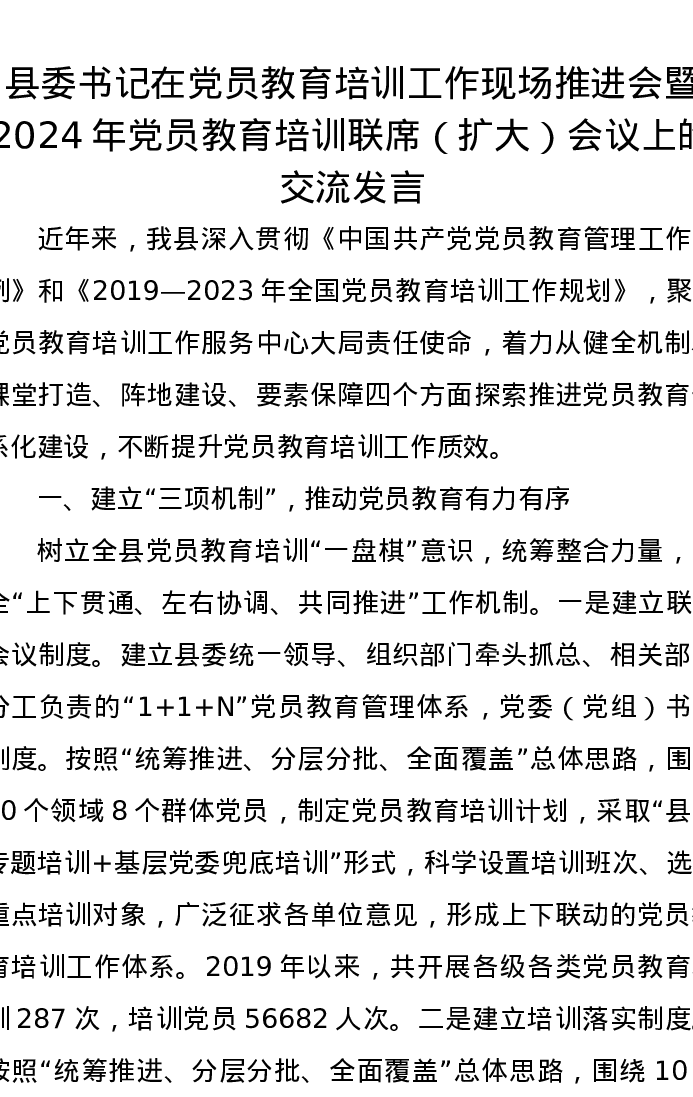 县委书记在党员教育培训工作现场推进会暨2024年党员教育培训联席(扩大)会议上的交流发言