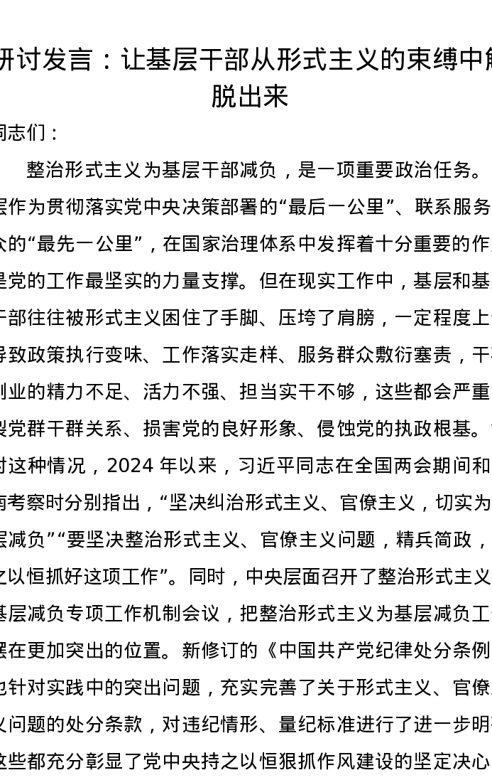研讨发言:让基层干部从形式主义的束缚中解脱出来