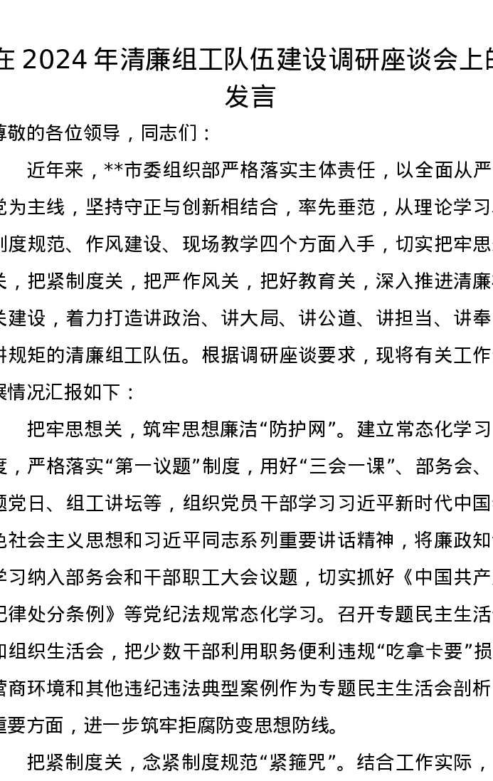 在2024年清廉组工队伍建设调研座谈会上的发言