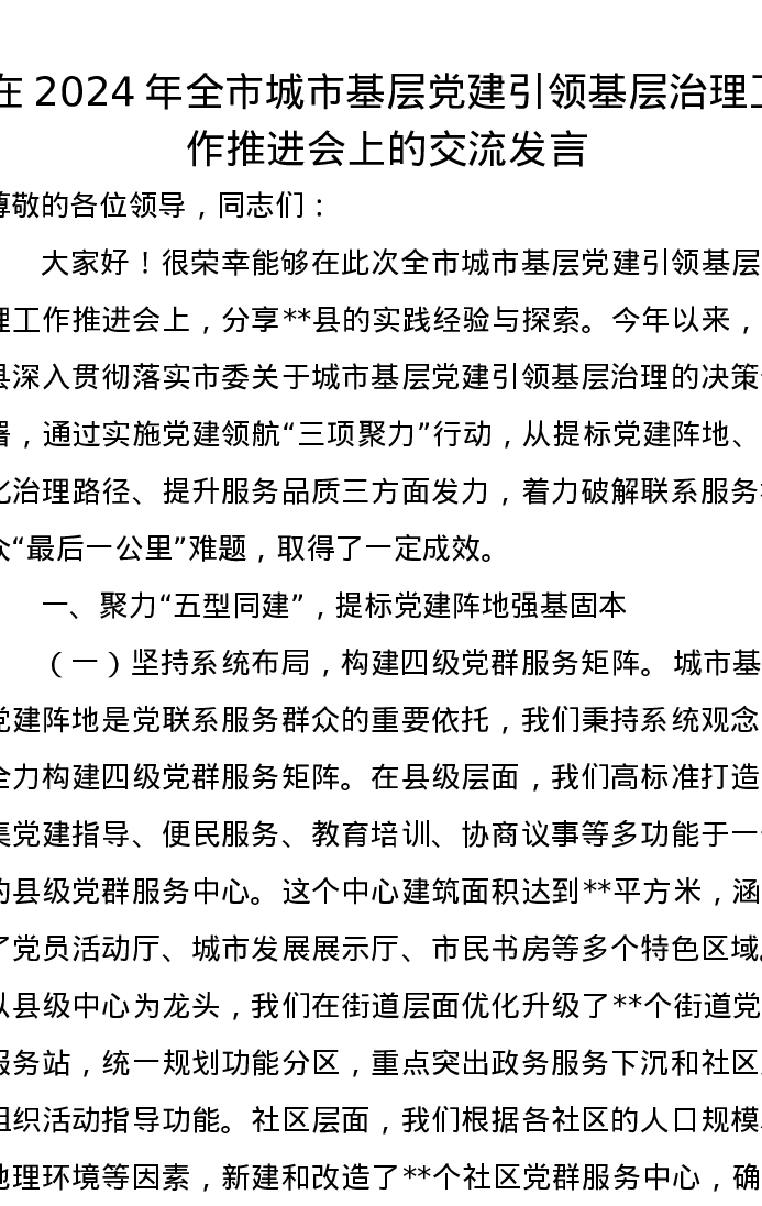 在2024年全市城市基层党建引领基层治理工作推进会上的交流发言