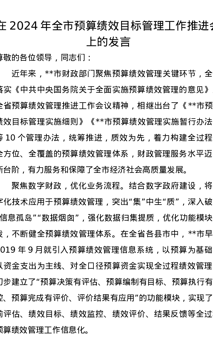 在2024年全市预算绩效目标管理工作推进会上的发言