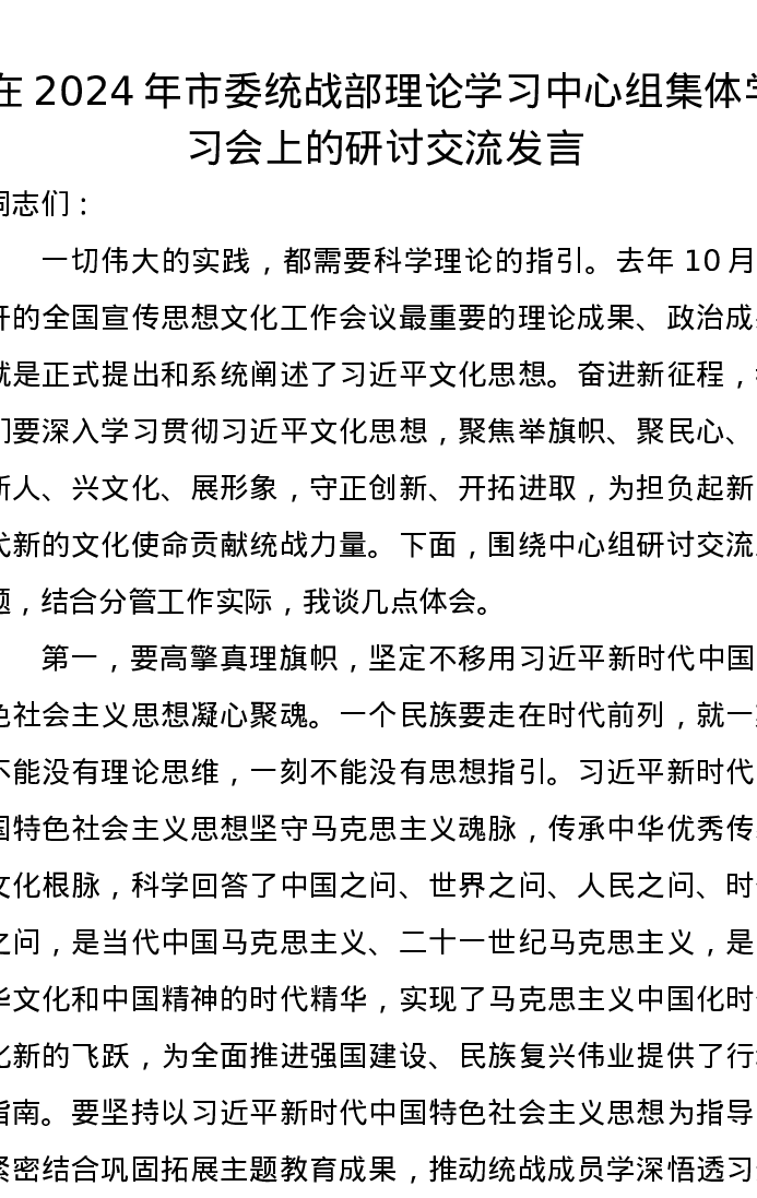 在2024年市委统战部理论学习中心组集体学习会上的研讨交流发言