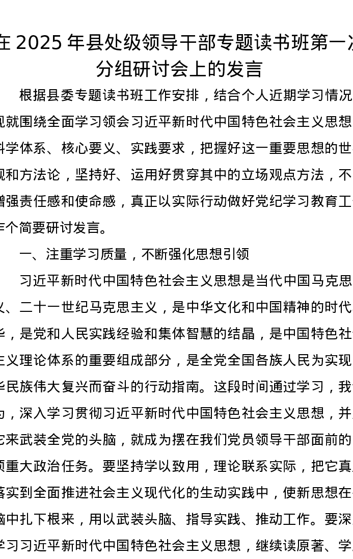 在2025年县处级领导干部专题读书班第一次分组研讨会上的发言