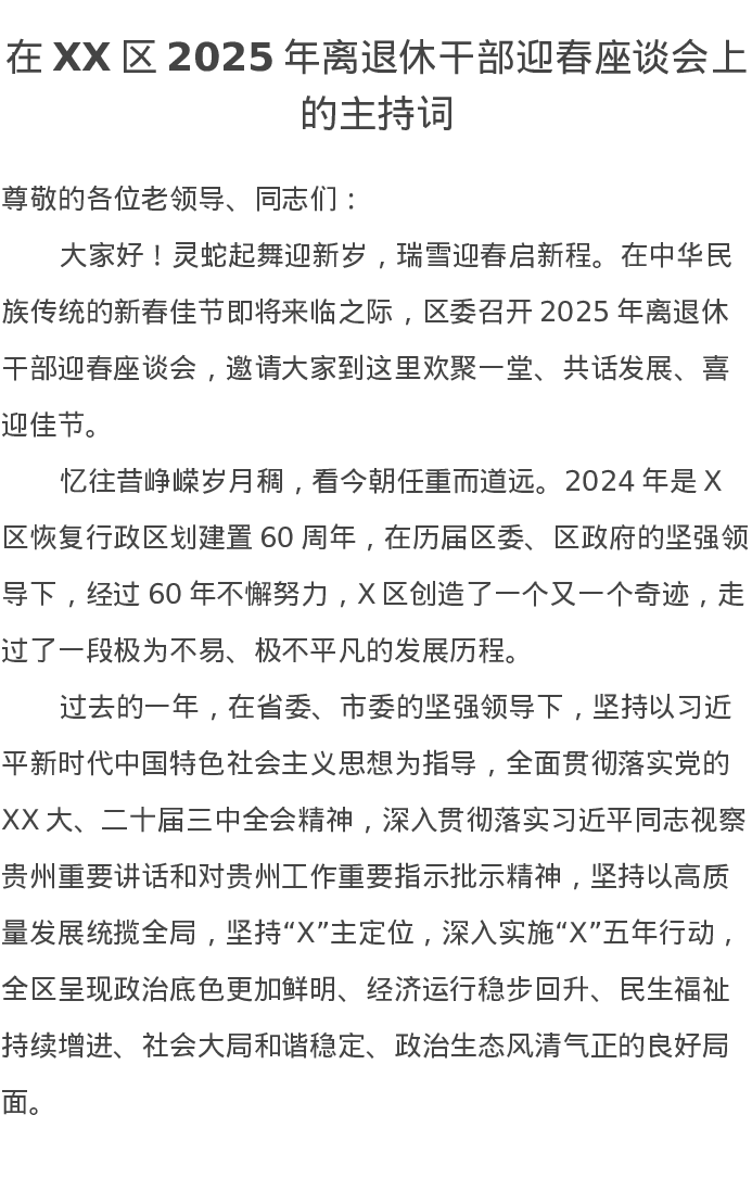 在XX区2025年离退休干部迎春座谈会上的主持词