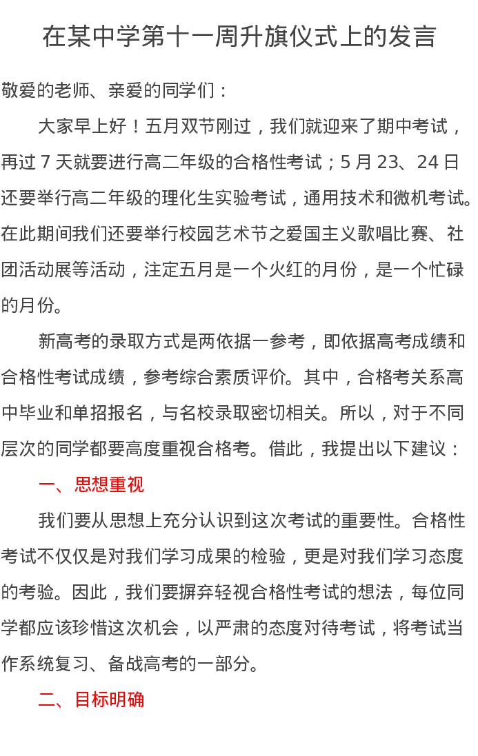 在某中学第十一周升旗仪式上的发言