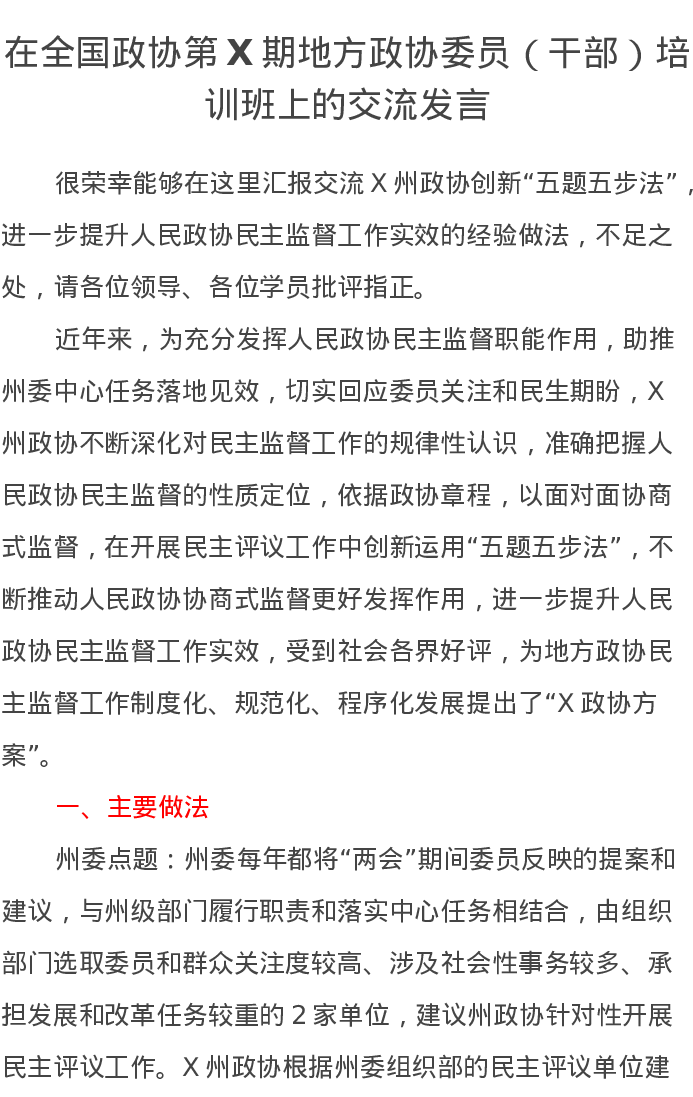 在全国政协第X期地方政协委员(干部)培训班上的交流发言2篇
