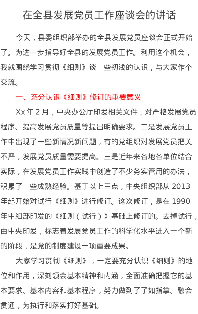 在全县发展党员工作座谈会的讲话