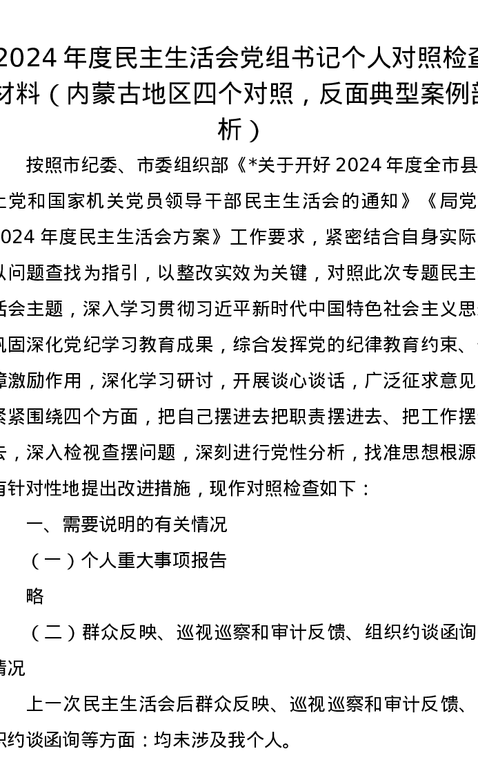 2024年度民主生活会党组书记个人对照检查材料(内蒙古地区四个带头,反面典型案例剖析)