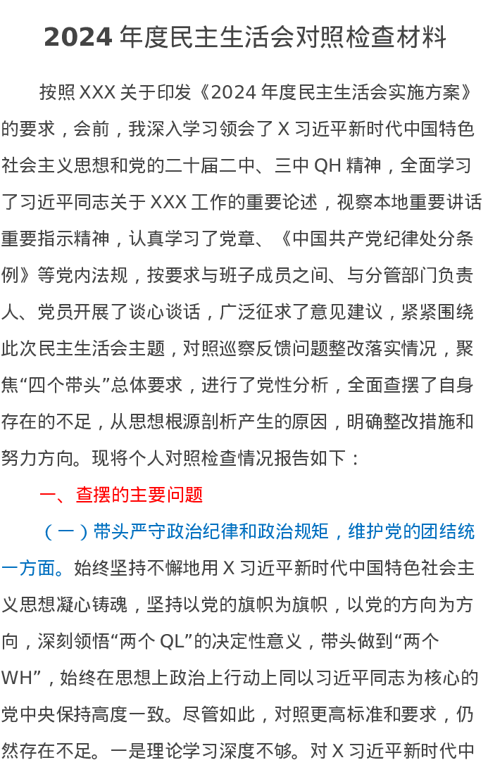 2024年度民主生活会对照检查材料(班子副职,含调查研究、案例对照)(四个带头)