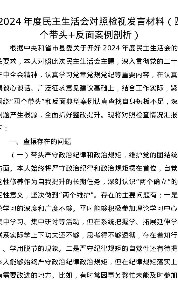 2024年度民主生活会对照检视发言材料(四个带头+反面案例剖析)