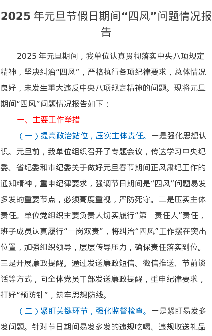 2025年元旦节假日期间“四风”问题情况报告